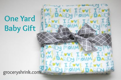 You will need: 2 receiving blankets 4 burp cloths 2 wipes containers 1 small package of size 1 diapers A children’s book or this Giraffe teether toy Washcloth animals (opt.) Rubberbands Plastic tray (with metallic finish from Dollar Tree) Ribbon …
